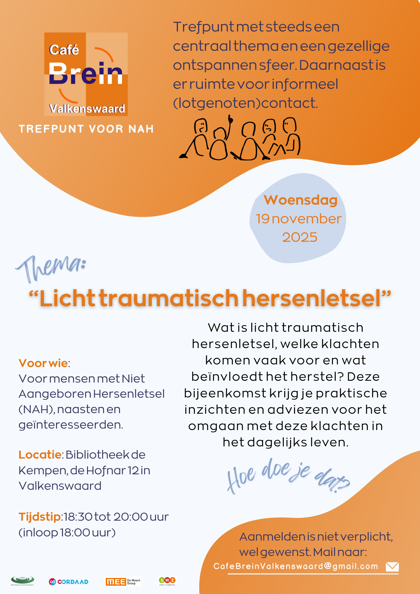 Café Brein is een trefpunt voor mensen met Niet Aangeboren Hersenletsel (NAH) en hun partners. Ook andere belangstellenden, familieleden, vrienden en hulpverleners, zijn welkom. Er vinden bijeenkomsten plaats waar in een gezellige en ontspannen sfeer een onderwerp centraal staat.